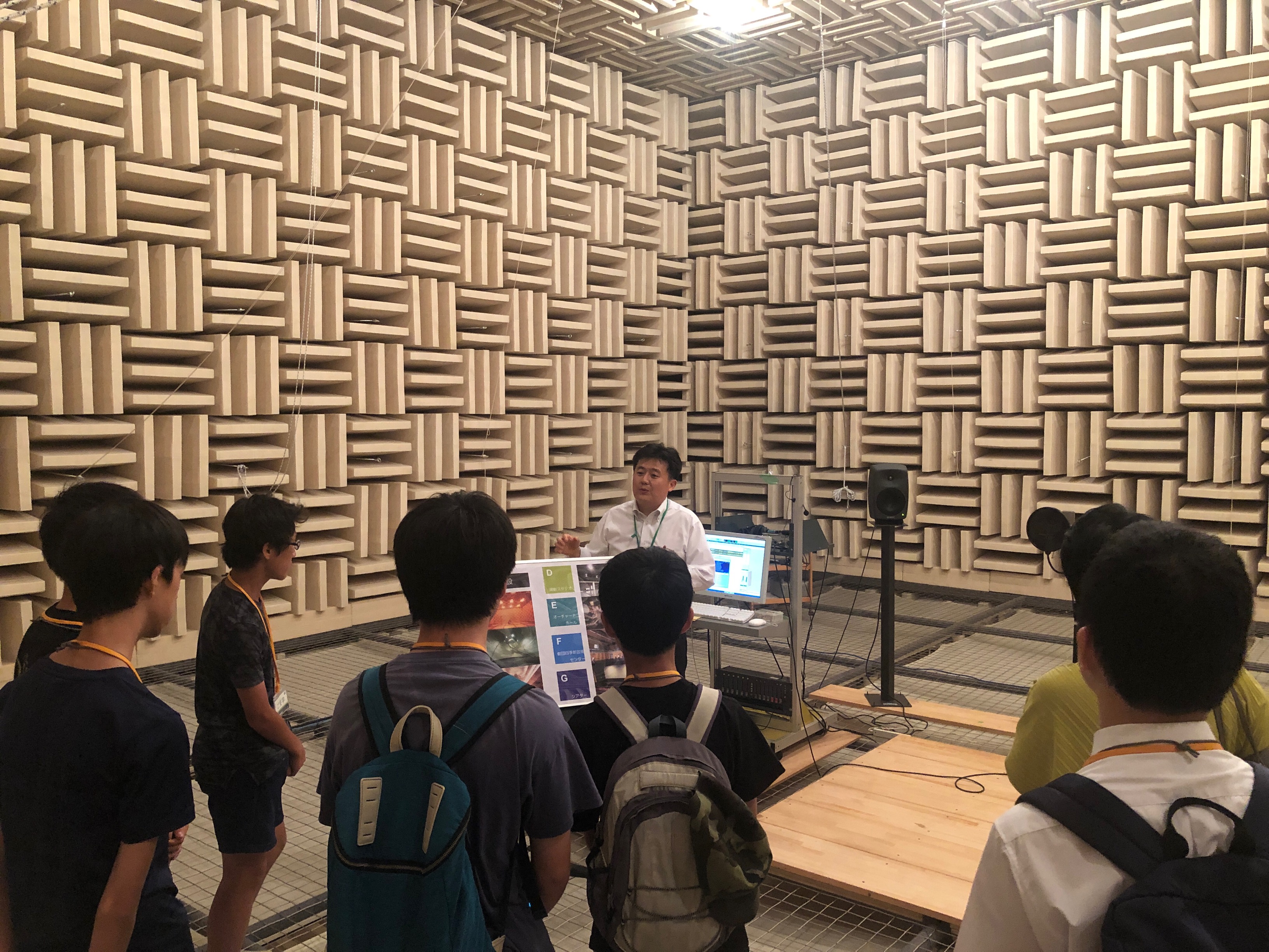 オーチャードホールで開催した3日間のプログラムとは別に、8月9日には東急建設株式会社の特別協力のもと、「音響体験ツアー」を実施。通常は見学ができない東急建設技術研究所(神奈川県相模原市)にお邪魔しました。研究所内の「無響室」や「残響室」に入り、声を出したり風船を割って音を出す実験を行い、音の響きの違いを体験しました。また、ホール建設時に使われていた縮尺模型を見ながら、コンサートホールの構造や仕組みについても学ぶことができました。